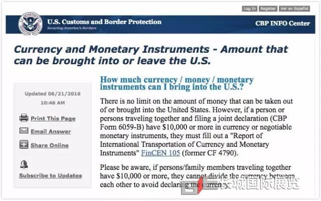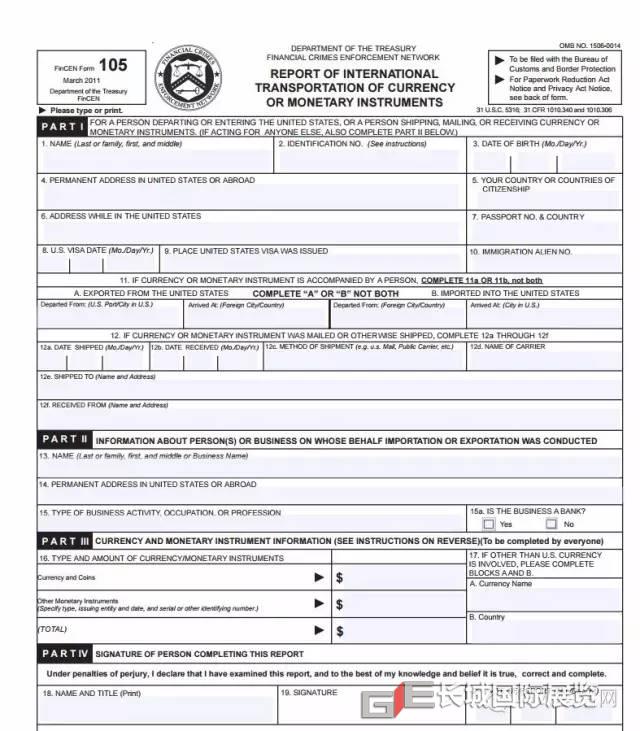 美國海關規定,如果攜帶現金或支票總金額超過$10,000(美元或等值外幣,或二者的組合),法律要求您填寫表格FinCEN 105(前海關表格4790)呈交海關及邊境保衛局。