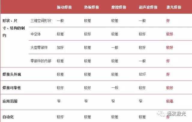 除了以上四種是主要的塑料焊接方法,目前還有一種新型的焊接方式——塑料激光焊接,下面我們先來(lái)看與傳統(tǒng)焊接技術(shù)相比,塑料激光焊接到底有哪些突出的地方?如下表