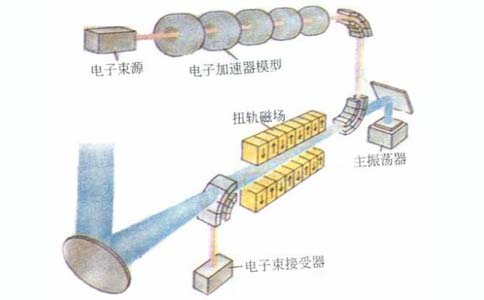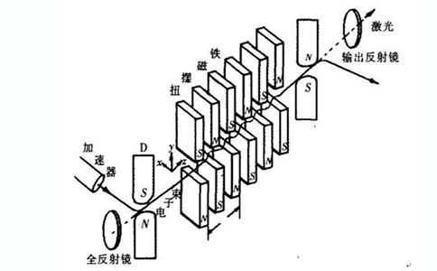 從加速器輸出的相對論電子束橫穿過周期性變化的波振器靜磁場。磁場方向與電子束垂直,故穿過的電子束被迫進行橫向振蕩,并向前方發(fā)射磁軔致輻射。在高能電子和光子的散射過程中,電子運動方向上的散射光子的頻率可由能量和動量守恒定律決定,波振器使聚焦的電子束在與光子束相互作用的整個過程中,始終保持在直線方向上。當電子束和光子束密度足夠大時,便形成受激散射,產生自由電子激光。自由電子激光器的輸出激光波長與電子能量有關,改變電子束的加速電壓就可以改變激光波長,這稱為電壓調諧。其調諧范圍很寬,原則上可以獲得任意波長的激光。