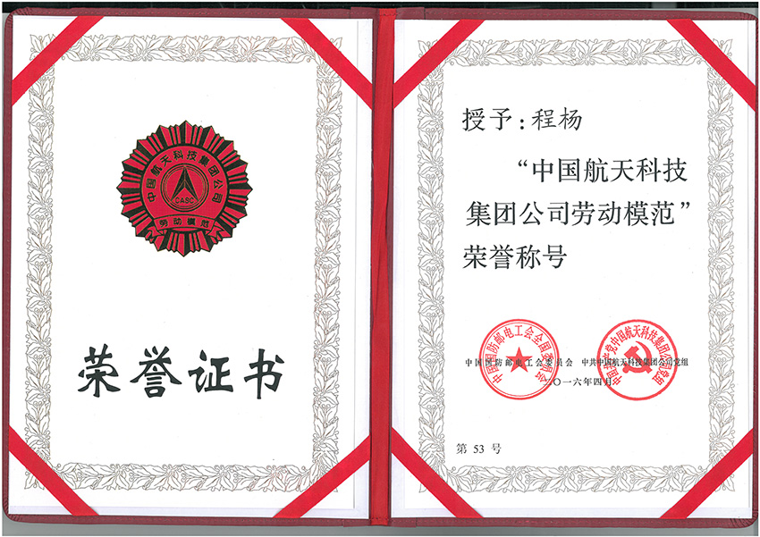 2016年4月,長城國際展覽責任有限公司總經,理程楊同志,榮獲“中國航天科技集團公司勞動模范”稱號。