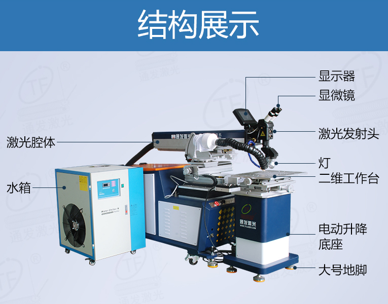 通發(fā)激光一體式模具激光焊機(jī)TFL-200YT/TFL-400YT是一款多種功能融合一體的新型模具激光焊接機(jī),針對特大型塑料模具激光焊、中型注塑模具激光燒焊、小型塑膠模具激光補(bǔ)焊、壓鑄模激光補(bǔ)焊具等各類模具可實(shí)現(xiàn)超精密修復(fù),幫您解決大型汽車模具修復(fù)難題,不需要模具移動,電動工作臺與立體旋轉(zhuǎn)激光頭完美結(jié)合,操作桿控制運(yùn)動移動實(shí)現(xiàn)輕松激光修復(fù)大型模具,同時也保留了傳統(tǒng)手動工作臺超精密修復(fù)模具功能。