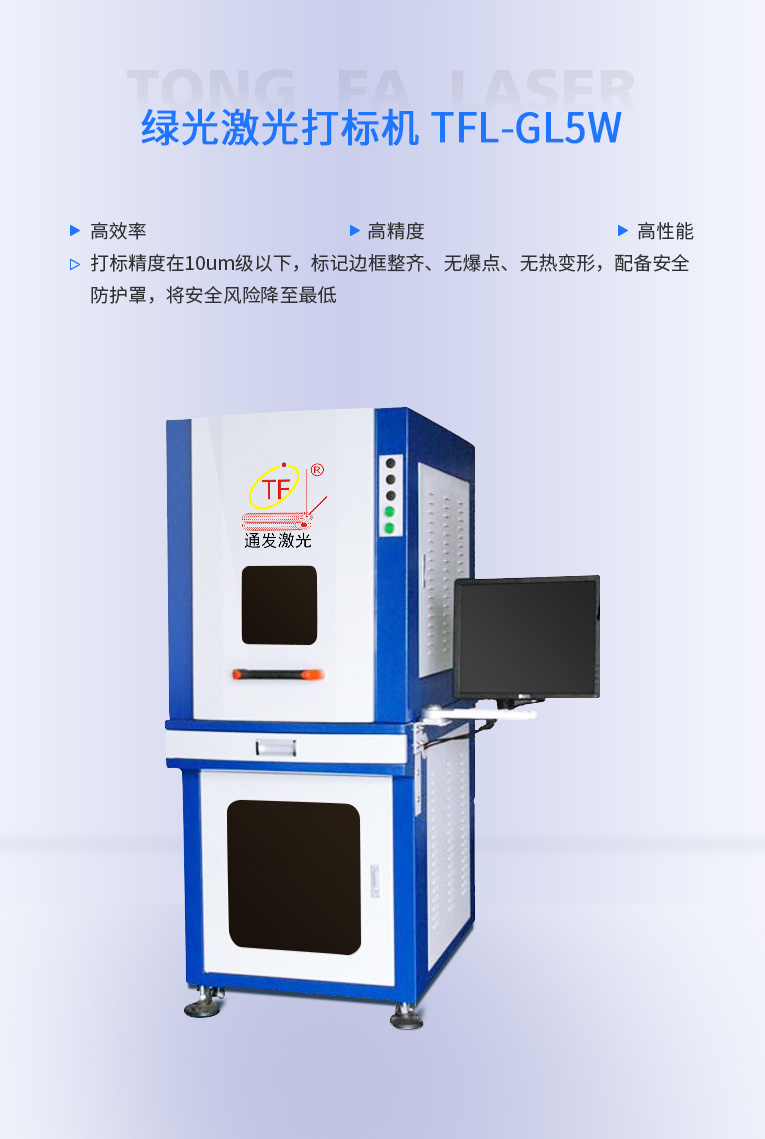 通發(fā)激光研發(fā)的TFL-GL3W/5W 綠光激光打標機配備安全防護罩,避免設備操作員誤操作引起的人身傷害,將安全風險降至最低,產品遠銷海內外.打標精度在10μm級以下,標記邊框整齊、無爆點、無熱變形,有效提高加工的成品合格率,使用壽命長、配合全封密光路、特別加固的光路底座滿足長期、穩(wěn)定性的工作需要。
